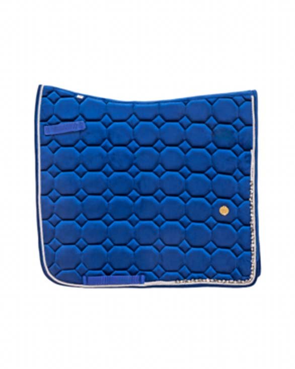 Made with a soft velvet and sport mesh backing for a timeless look. Unique hand beaded trim adds a touch of elegance like no other. Foam padded for extra comfort on your horses back. High wither design. Brass logo detail.